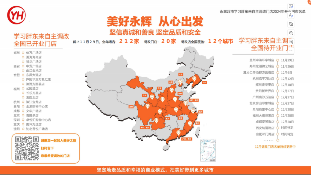 5月6日那天,東來(lái)哥了解永輝的經(jīng)營(yíng)情況和財(cái)務(wù)狀況后,跟我們分享了很多文化理念和經(jīng)營(yíng)方法。我記得東來(lái)哥最后結(jié)合我們的癥狀給出的藥方核心是三點(diǎn):①把經(jīng)營(yíng)不好或是沒(méi)能力經(jīng)營(yíng)好的店閉好;②把有條件調(diào)改的店調(diào)好;③這個(gè)過(guò)程要保持輕松;厝ヒ院笪覀兙桶凑者@個(gè)方向,做了整體的工作規(guī)劃。2024年截至今天,我們關(guān)閉了212家門店,今天也剛好調(diào)改是20家門店,覆蓋全國(guó)12個(gè)城市。