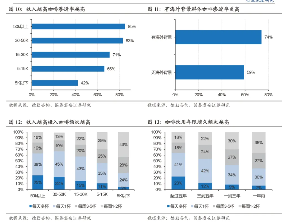 可以預(yù)見,下沉市場免不了一輪新的價(jià)格戰(zhàn),并且難度比一線城市大不少——收入越高,咖啡滲透率越高,攝入咖啡頻次越高,應(yīng)用年限越久····