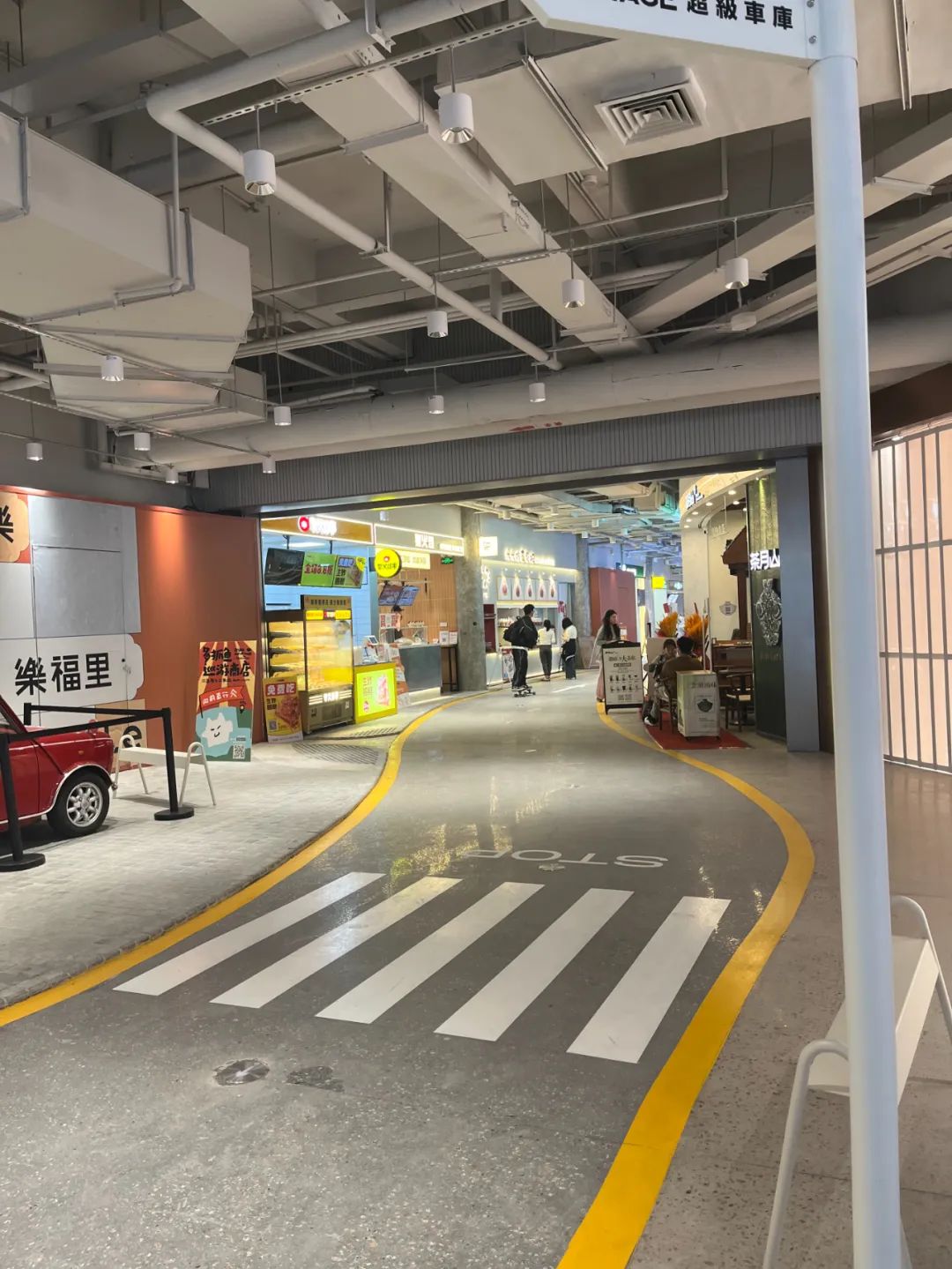從地鐵口進(jìn)來,就是kaledo的B1層,順著左側(cè)的圍擋直走就是項目打造的實驗空間“超級車庫GARAGE”,往右側(cè)就能進(jìn)入到更加有煙火氣的場域“樂福里街區(qū)”。