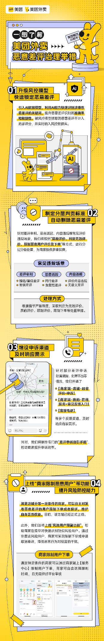 鑒于此,美團(tuán)外賣多部門聯(lián)合成立了“惡意差評治理專項組”,從差評的識別、判責(zé)、申訴、預(yù)警等多個環(huán)節(jié)入手,搭建更透明高效的差評處理機制,幫助商家將精力更好地投入到線上經(jīng)營中去,共同打造公平、健康的餐飲生態(tài)環(huán)境。