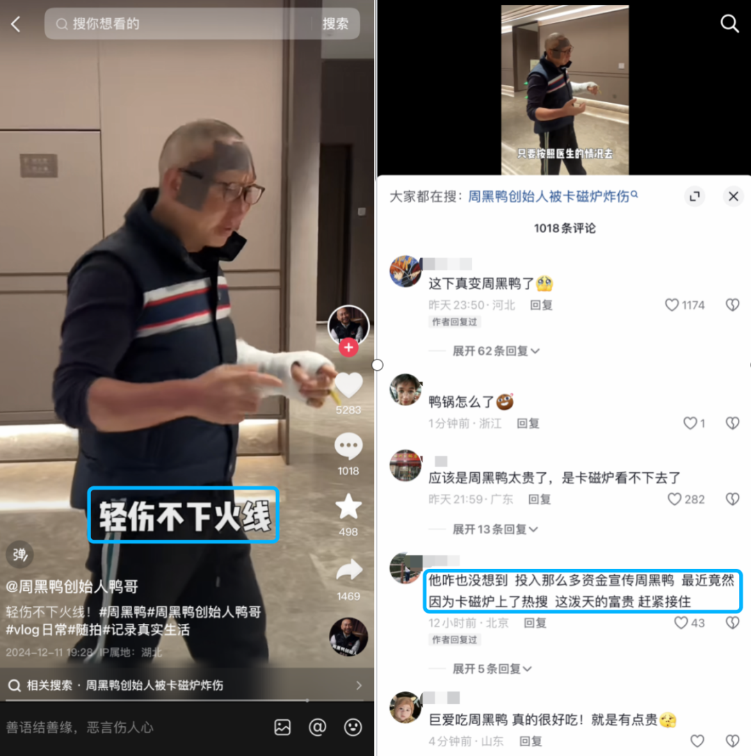 直至被卡磁爐炸傷事件后,上述賬號(hào)熱度攀升。同時(shí),周富裕也在12月11日最新發(fā)布的一條短視頻中回應(yīng)了網(wǎng)友有關(guān)“帶傷直播”的質(zhì)疑,他表示:作為企業(yè)創(chuàng)始人必須躬身入局,成功的企業(yè)家輕傷不下火線。