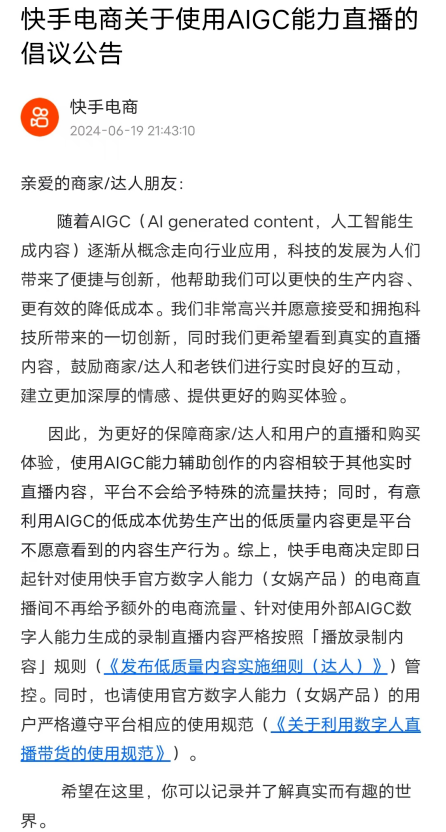 同時(shí),快手電商采取了更為嚴(yán)格的措施來規(guī)范直播內(nèi)容。對(duì)于采用官方數(shù)字人產(chǎn)品“女媧”進(jìn)行直播的電商直播間,快手決定不再額外提供電商流量支持,以此鼓勵(lì)商家和主播探索更多元化、更具真實(shí)感的直播形式。