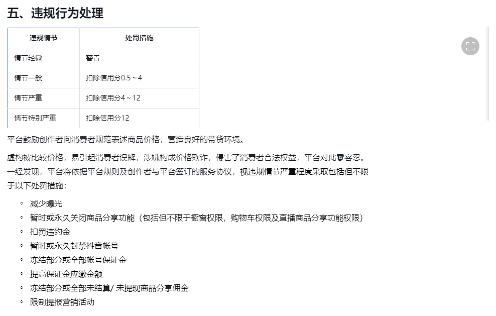 對(duì)于虛假比價(jià)行為,若情節(jié)特別嚴(yán)重,將直接面臨扣除12分信用分、永久封禁抖音賬號(hào)及凍結(jié)全部保證金和傭金的嚴(yán)厲處罰,處罰力度大大提升。