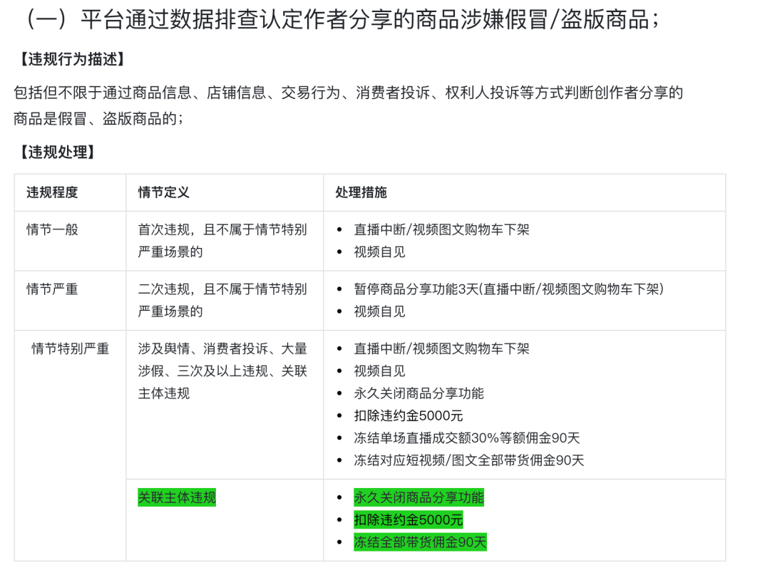 任何創(chuàng)作者在與用戶交流互動(dòng)過程中,若分享假冒或盜版商品及其相關(guān)信息,均將被視為違規(guī)行為,并將面臨包括直播中斷、內(nèi)容刪除、商品下架、保證金及帶貨傭金凍結(jié)、違約金扣除等一系列處罰措施。