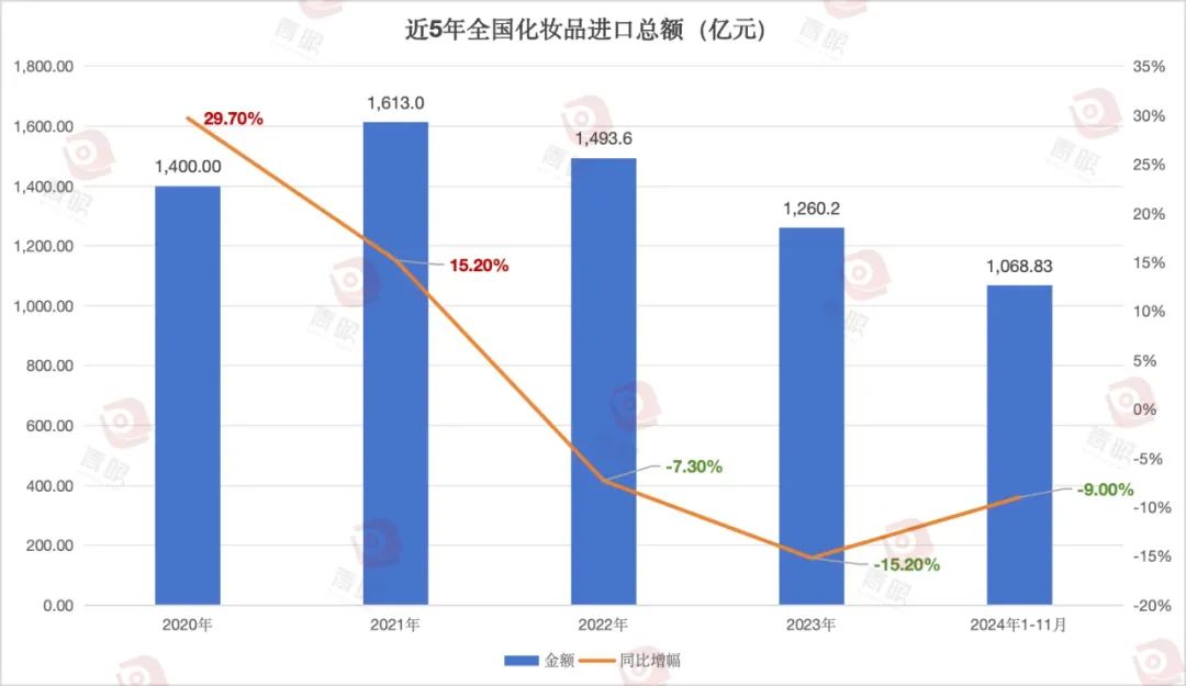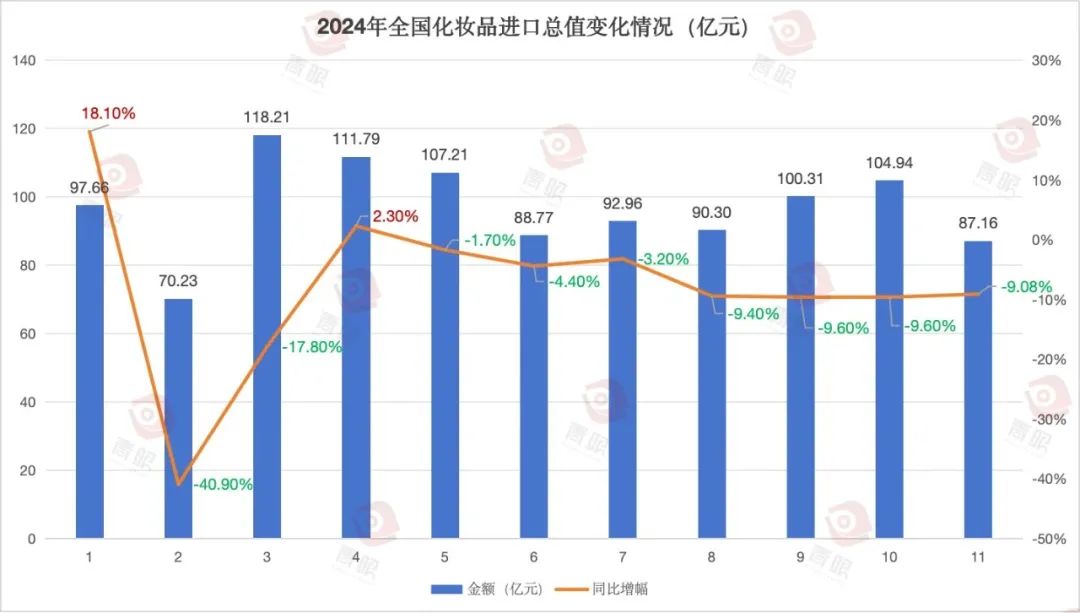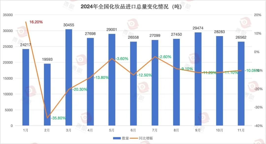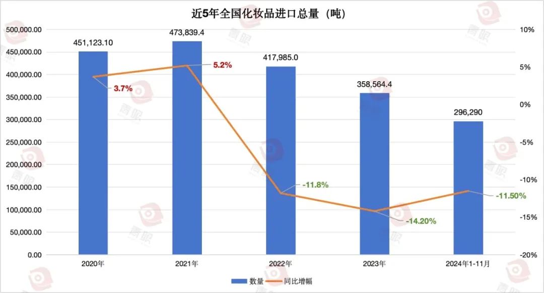 雖然從整體來看,我國進出口貿(mào)易均仍在緩慢增長,但化妝品進口數(shù)據(jù)表現(xiàn)卻遠不及大盤。海關總署數(shù)據(jù)顯示,2024年我國美容化妝品及洗護用品(以下簡稱“化妝品”)整體仍呈現(xiàn)下滑態(tài)勢,1-11月我國化妝品累計進口額為296289.78噸,同比下滑11.5%;累計進口金額為1068.83億元,同比下滑9%。