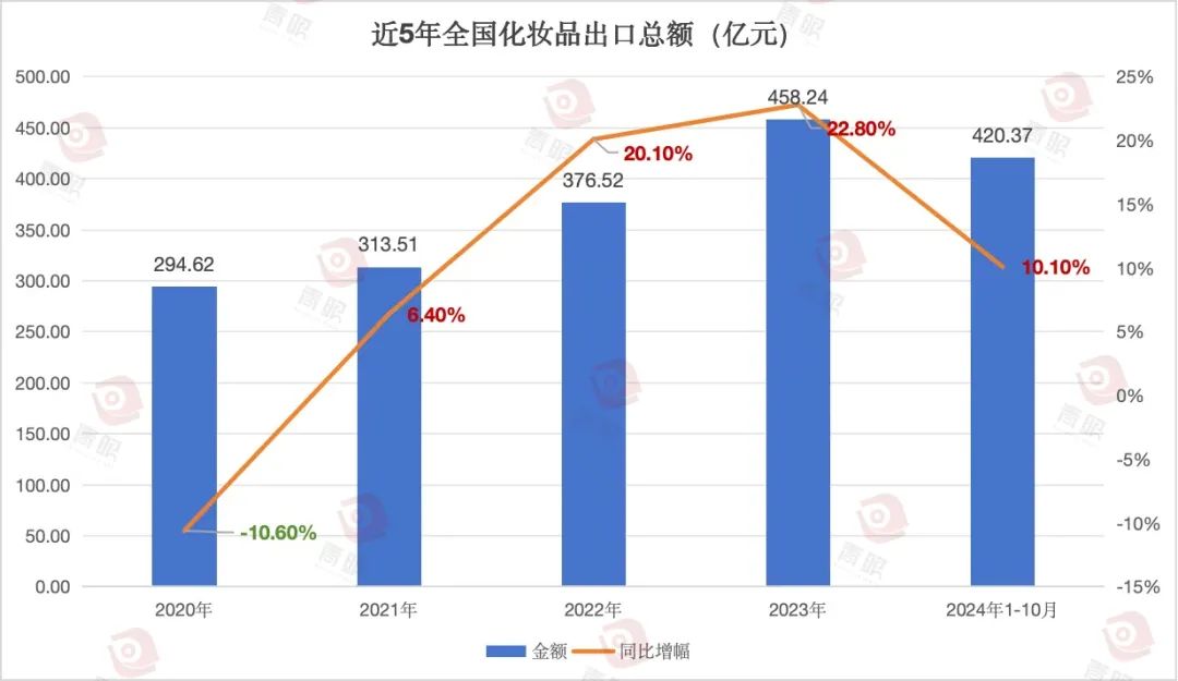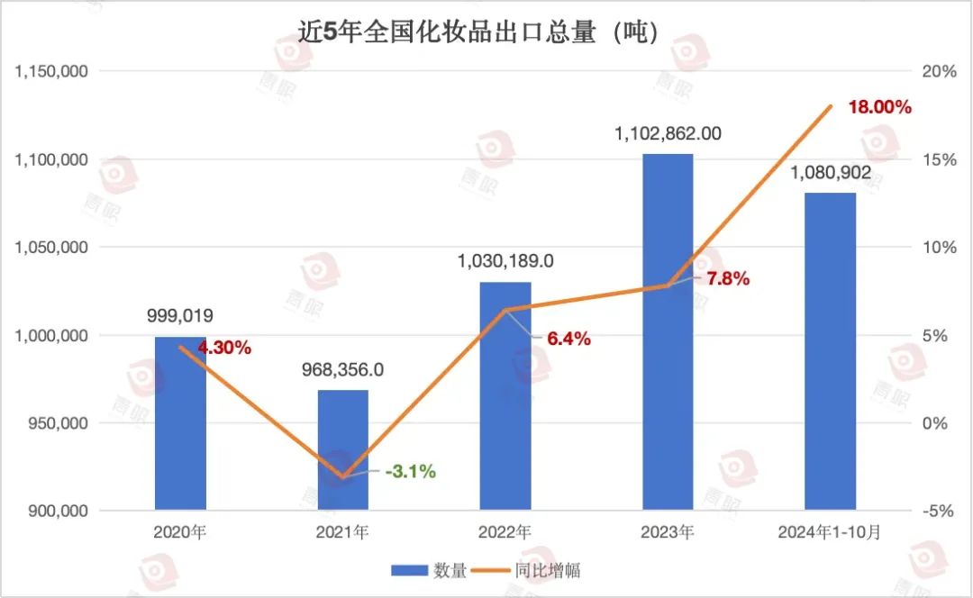 海關總署數(shù)據(jù)顯示,今年1-10月,我國化妝品出口總量為1080902噸,同比增長18%;出口總額為420.37億元,同比增長10.1%。就這一數(shù)據(jù)而言,雖然當前我國化妝品進口體量不如出口,但從增長幅度來看,化妝品出口表現(xiàn)正在愈發(fā)活躍,且仍有較大的增長空間。