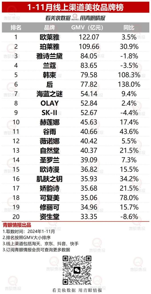 雖然,從絕對GMV上,上述外資品牌的成績遠遠超過了當下大部分的國貨品牌。但同時,青眼也注意到,從線上渠道來看,雅詩蘭黛、蘭蔻、SK-II、資生堂品牌均為負增長,其中資生堂甚至下滑了8.6%。