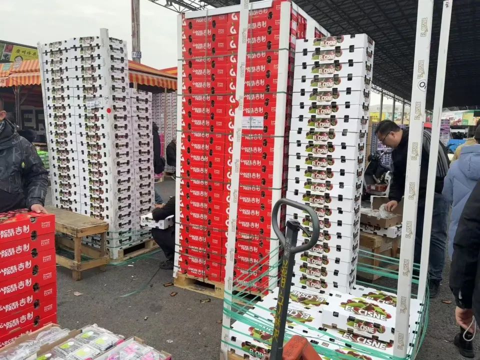 “這是剛卸下來(lái),剛拉過(guò)來(lái)的”,12月13日上午,江南市場(chǎng)進(jìn)口水果區(qū)的叫賣聲此起彼伏,采購(gòu)商們?cè)谕鶃?lái)不絕的運(yùn)貨叉車、三輪摩托中穿梭。早上8點(diǎn)多,就有采購(gòu)以300元/10斤的價(jià)格買走一位老板手中最后9箱產(chǎn)自阿根廷的某款J級(jí)車?yán)遄印?/p>