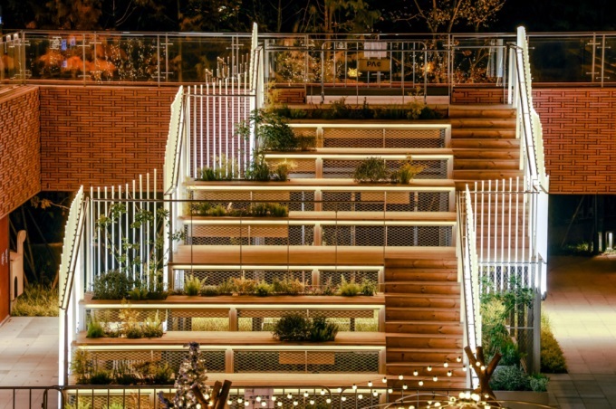 出于人們對(duì)自然的傾向與渴望,PAC讓空間的生命力再次煥新。從豐富的綠植景觀設(shè)計(jì),到天然木材等材料的使用,PAC始終將人的活動(dòng)融入自然場(chǎng)景。在露臺(tái)空間中,“蛋殼露臺(tái)”和“好白相活動(dòng)場(chǎng)”以木結(jié)構(gòu)裝置和景觀設(shè)計(jì)構(gòu)建了休憩、互動(dòng)、娛樂的多功能區(qū)域。而在地面與露臺(tái)銜接處,幾組階梯的布置,轉(zhuǎn)變?yōu)椤罢估取薄ⅰ坝^演山坡”等互動(dòng)場(chǎng)景,既適合親子娛樂,又為寵物社交打造全新場(chǎng)所,讓人與自然實(shí)現(xiàn)更多維度的情感連接。