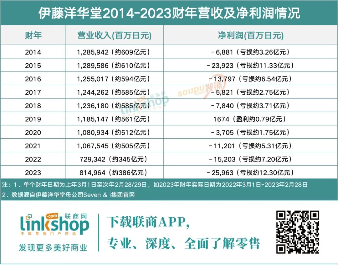 從凈利潤上看,伊藤洋華堂自2014財(cái)年開始陷入虧損,除2019財(cái)年短暫盈利至16.74億日元(折合人民幣約0.79億元)外,其他年份均處于虧損狀態(tài)。十年間純虧損年份的累計(jì)虧損高達(dá)1,143億日元(折合人民幣約54.15億元)。