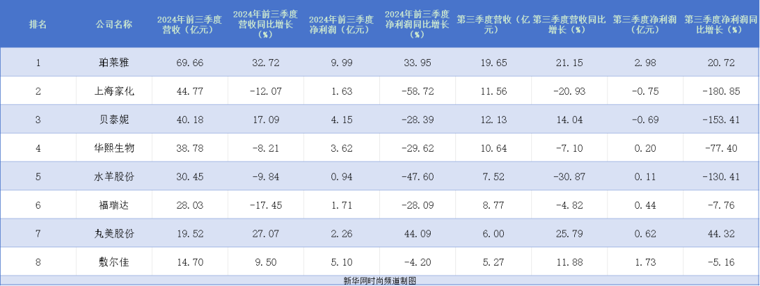 根據(jù)國內(nèi)頭部上市美妝企業(yè)三季報對比,業(yè)績分化明顯,競爭更加激烈。從營收排名看,2024年前三季度,珀萊雅實現(xiàn)營業(yè)收入69.66億元,同比增長32.72%,位居榜首。上海家化,前三季度實現(xiàn)營收44.77億元,同比下降12.07%;貝泰妮實現(xiàn)營業(yè)收入40.18億元,同比增長17.09%;而華熙生物、水羊股份、福瑞達(dá)等前三季度營收同比去年均下滑。