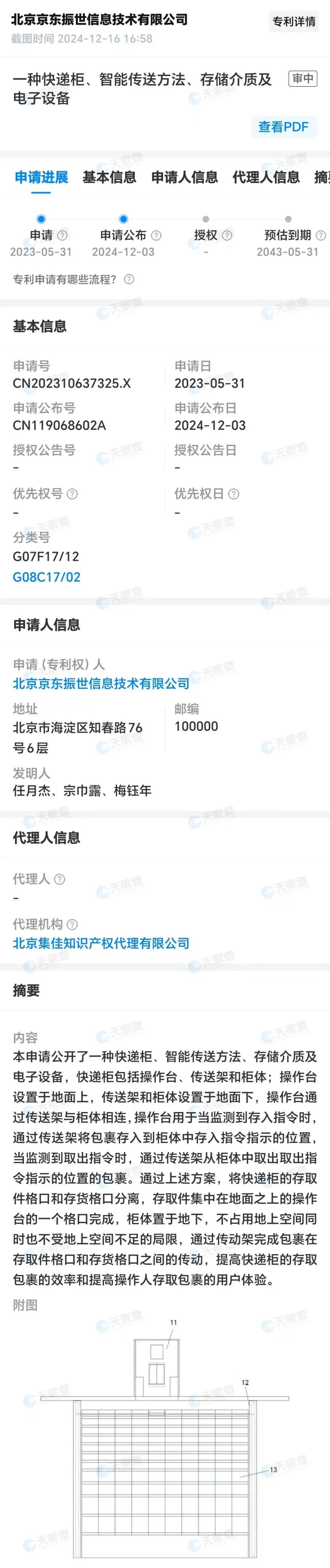 天眼查信息顯示,京東在2023年便已申請快遞柜相關專利,專利名稱為“一種快遞柜、智能傳送方法、存儲介質及電子設備”,公開號為CN119068602A。