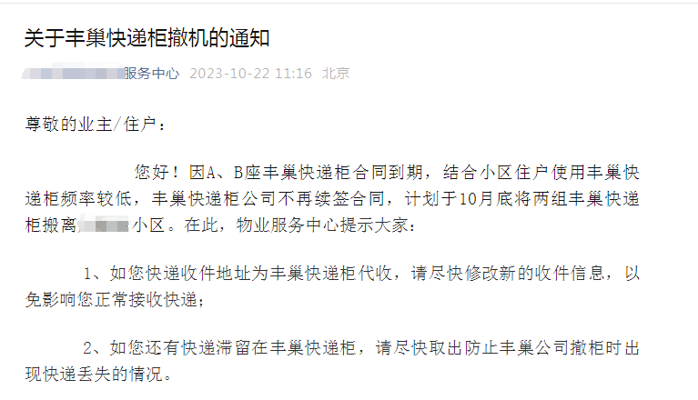 北京某小區(qū)物業(yè)發(fā)布快遞柜撤柜聲明