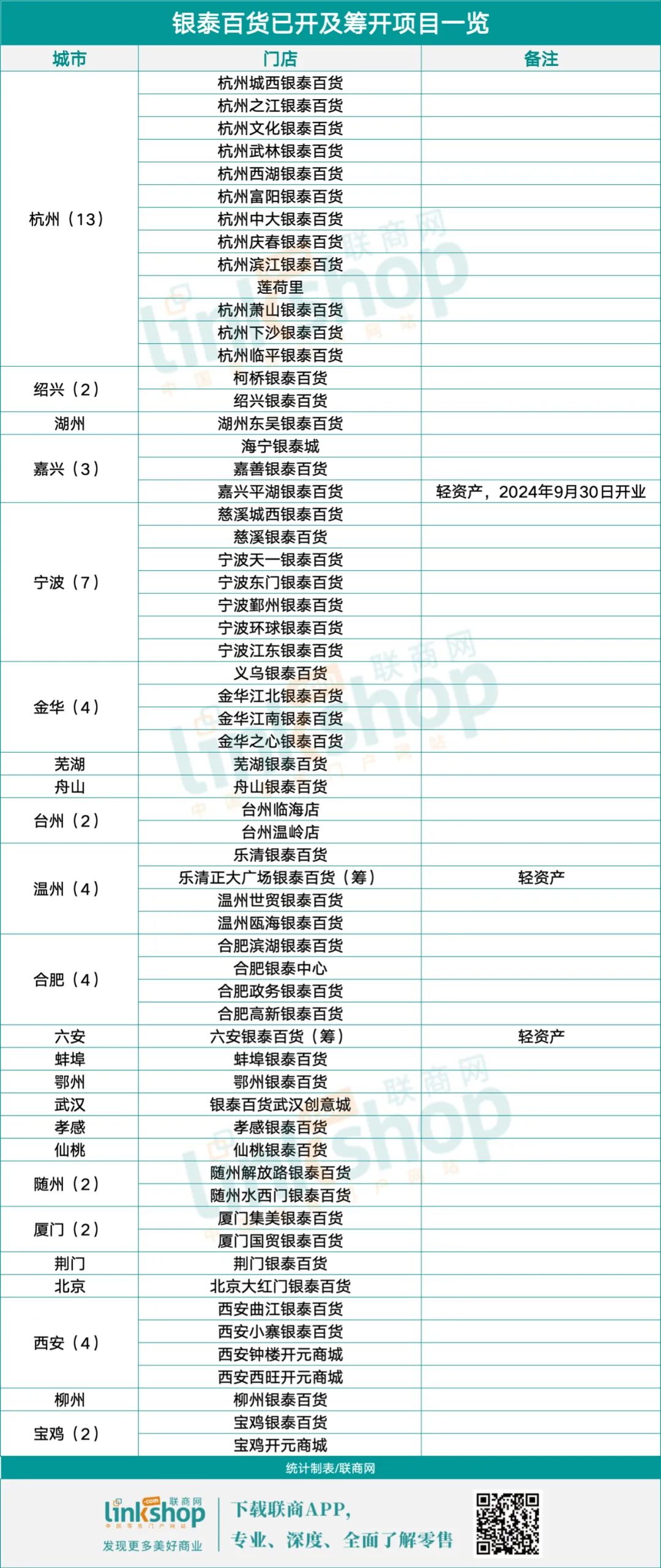 《聯(lián)商網(wǎng)》查閱喵街發(fā)現(xiàn),截至目前銀泰百貨已開及籌開共有61個項目,其中3個是輕資產(chǎn)項目,此外,另外2個輕資產(chǎn)項目南昌八一廣場銀泰百貨、揚州銀泰百貨并未出現(xiàn)在列表中,再加上剛簽約的榆林銀泰百貨項目,這也意味著銀泰百貨截至目前已披露的已開及籌開共有64個項目(含5個輕資產(chǎn)項目)。其中,南昌、揚州這兩個項目計劃2025年開業(yè)。