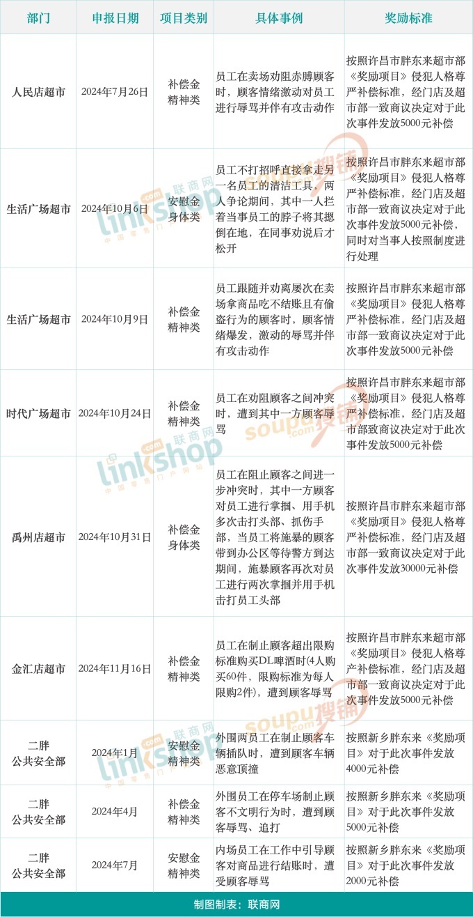 截止2024年11月25日,胖東來各業(yè)態(tài)侵犯人格尊嚴補償標準的執(zhí)行情況如下: