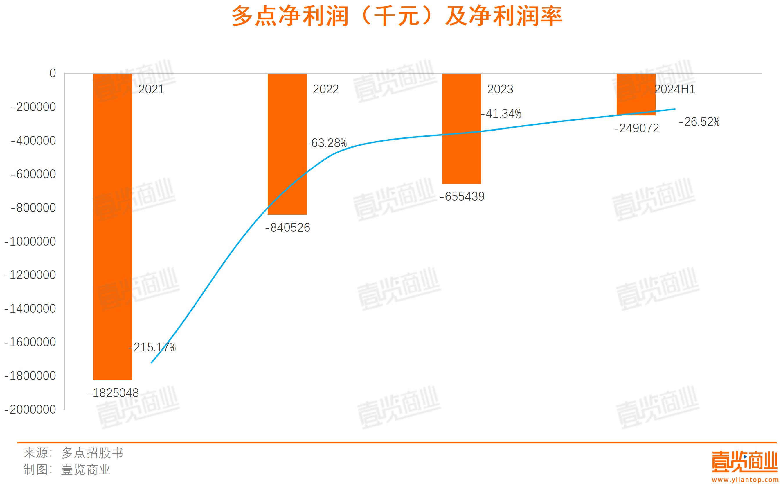 即便營(yíng)收、毛利雙雙上漲,但多點(diǎn)仍處于虧損之中。截至報(bào)告期各期末,多點(diǎn)的凈虧損分別為18.25億元、8.41億元、6.55億元和2.49億元;凈利潤(rùn)率為-215.17%、-63.28%、-41.34%和-26.52%。