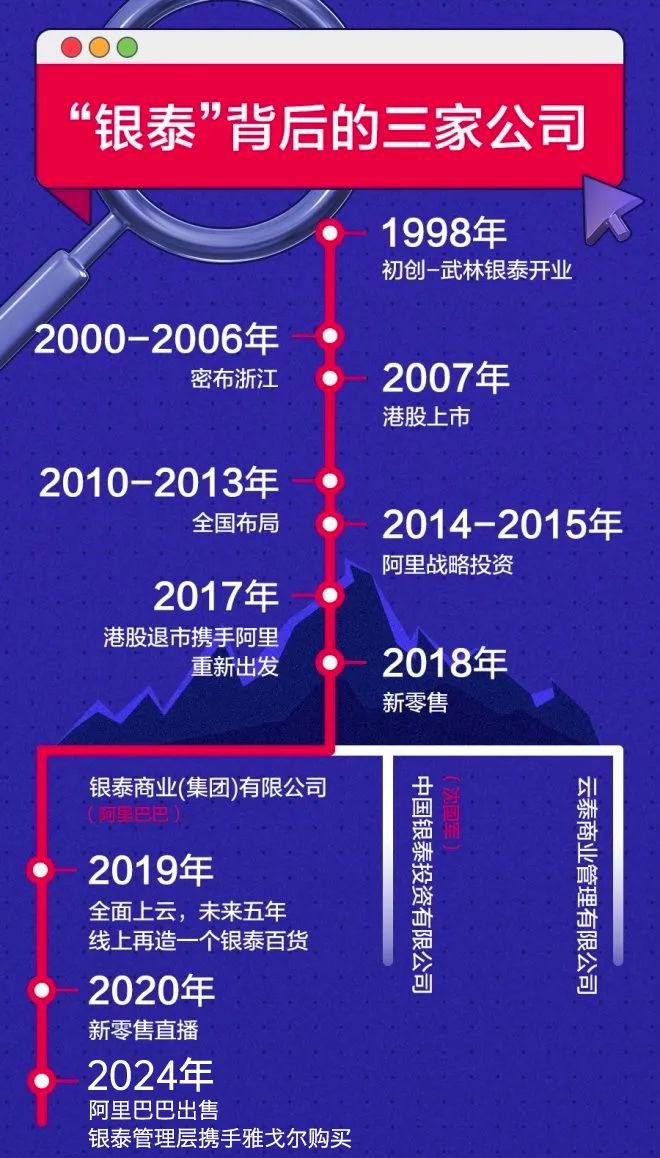 2007年,銀泰百貨在香港上市,成為中國(guó)內(nèi)地民營(yíng)百貨業(yè)在港交所上市的先例?。此后銀泰百貨繼續(xù)擴(kuò)大市場(chǎng)規(guī)模,并于2014年攜手阿里巴巴集團(tuán)。2017年,銀泰百貨完成私有化退市,開啟了數(shù)字化變革?。2024年12月,阿里巴巴宣布將銀泰百貨的全部股權(quán)出售給雅戈?duì)柤瘓F(tuán)和銀泰管理團(tuán)隊(duì)組成的財(cái)團(tuán)。