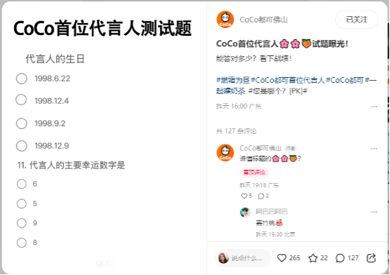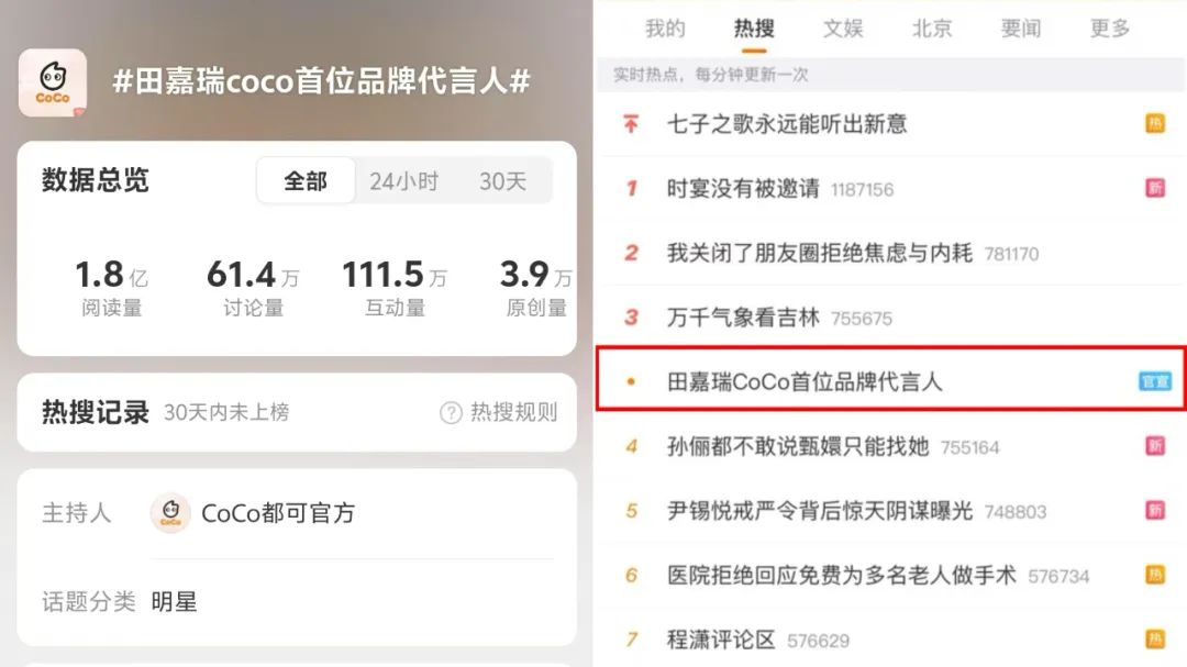 截至發(fā)稿前,話題#田嘉瑞CoCo首位品牌代言人#、#CoCo莓好冬日加點田#、#田嘉瑞和草莓好配#等話題閱讀量突破2億,討論量接近120萬,大批粉絲表示“溫暖貼心天生CP”“甜甜的小田和草莓真的好搭”。