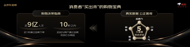 今年以來(lái),有近9億人次通過(guò)金榜完成下單,近80%的消費(fèi)者瀏覽京東金榜后,在不到10秒的時(shí)間就能找到心儀的商品。金榜持續(xù)受到眾多消費(fèi)者信賴,其根源是因?yàn)樵u(píng)選機(jī)制的公正客觀。目前,商品的銷售、口碑、人氣、品牌力和增速是登上金榜的重要指標(biāo),這些指標(biāo)綜合反映了廣大消費(fèi)者的實(shí)際購(gòu)買選擇、使用體驗(yàn)和評(píng)價(jià)反饋,也正因如此,京東金榜才持續(xù)成為消費(fèi)者購(gòu)物決策的可靠指南。
