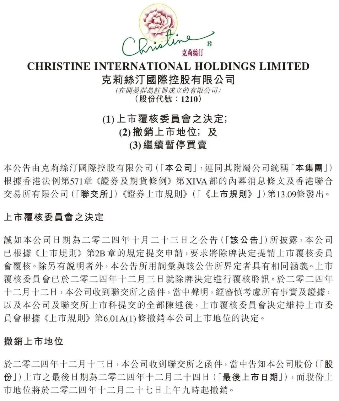 到了今年12月13日晚,克莉絲汀發(fā)布公告稱,將在12月27日被撤銷上市地位。
