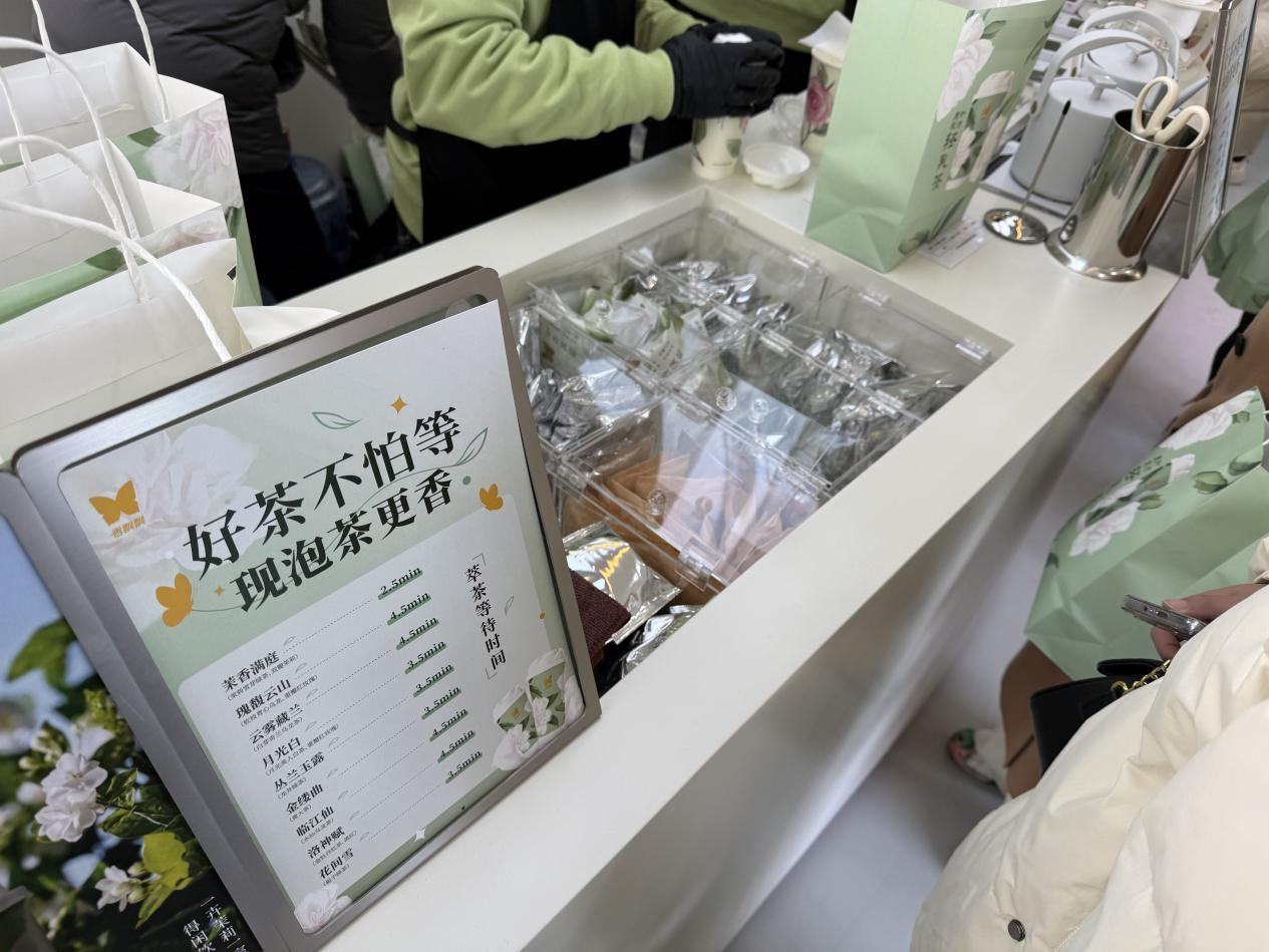 其次,該門店整體布局都在強調“茶”這一元素。例如,正門口的點單處設置了茶包展示區(qū),所有口味的茶包都在此擺放。門店有多處墻面掛著類似“原葉茶包”的宣傳標語。