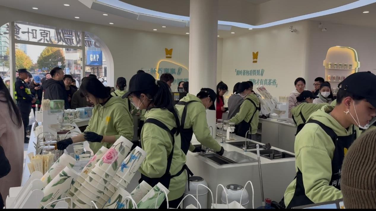 首先,該快閃店相較之前的“自助奶茶店”,更強調人工服務。壹覽商業(yè)注意到,50平米左右的門店空間內,負責幫助消費者制茶的員工就有十余位。從茶包萃取、倒入鎖鮮奶、混合并加入熱水的全流程,都由員工在前臺展示給消費者。