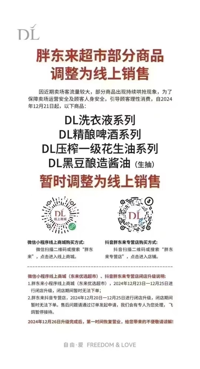 12月20日,胖東來(lái)發(fā)布聲明,因近期賣場(chǎng)客流量較大,為了保障賣場(chǎng)運(yùn)營(yíng)安全及顧客人身安全,引導(dǎo)理性消費(fèi),自2024年12月21日起,部分商品轉(zhuǎn)至線上銷售!