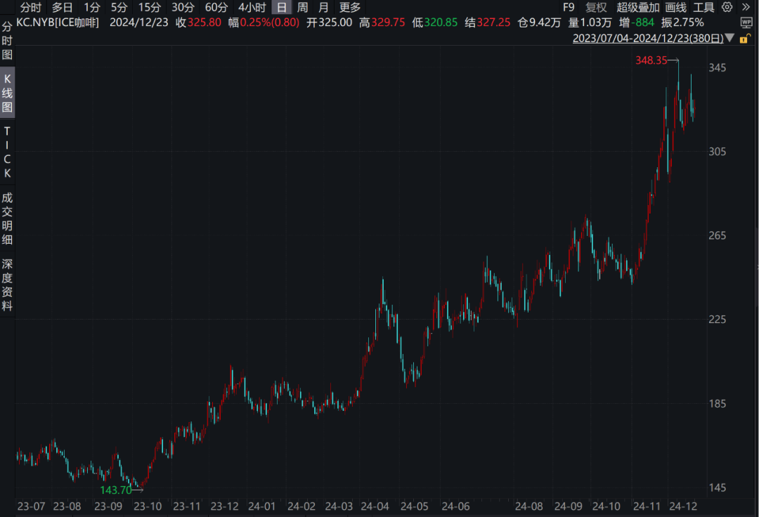 近期,在美國紐約洲際交易所(ICE)上市的阿拉比卡咖啡期貨價格暴漲,最高達到3.35美元/磅,突破了1977年以來的歷史最高記錄。