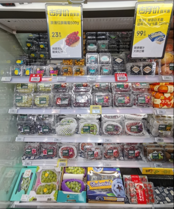 點(diǎn)評:通過對比,我們發(fā)現(xiàn)在水果品類上,京東七鮮主要著重經(jīng)營蘋果、梨、橙、香蕉等常規(guī)水果;而盒馬鮮生則重點(diǎn)著重經(jīng)營差異化較明顯的地標(biāo)性小品種水果和時令漿果類,同時兼顧常規(guī)基礎(chǔ)水果經(jīng)營。另外,兩者都非常重視鮮切果切的經(jīng)營,并進(jìn)行了重點(diǎn)放大陳列。因此,盒馬鮮生在水果的豐富性和差異性上要明顯優(yōu)于京東七鮮。
