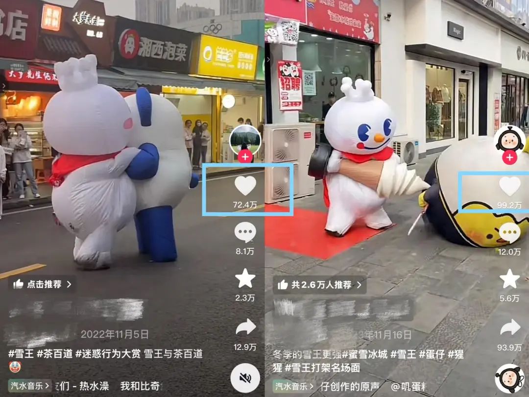 此后,雪王便開啟了“街溜子”模式,不斷在社交媒體上通過巡街和四處“碰瓷”主動刷臉社交媒體并制造話題。抖音平臺上,雪王在茶百道門口挑釁其IP丁丁貓的打架視頻,單條點贊量突破72萬;雪王“打敗”蛋仔的打架視頻即將突破百萬點贊。