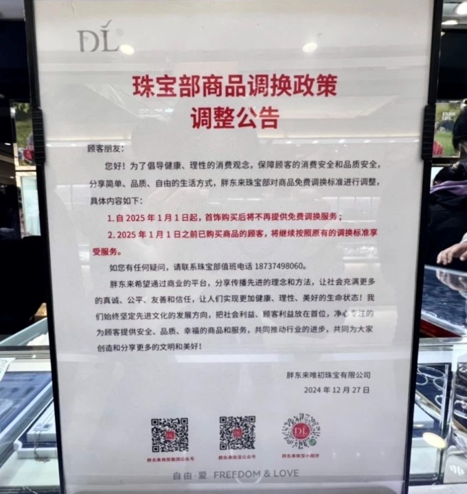 公告顯示,自2025年1月1日起,首飾購買后將不再提供免費調換服務;2025年1月1日之前已購買商品的顧客,將繼續(xù)按照原有的調換標準享受服務。