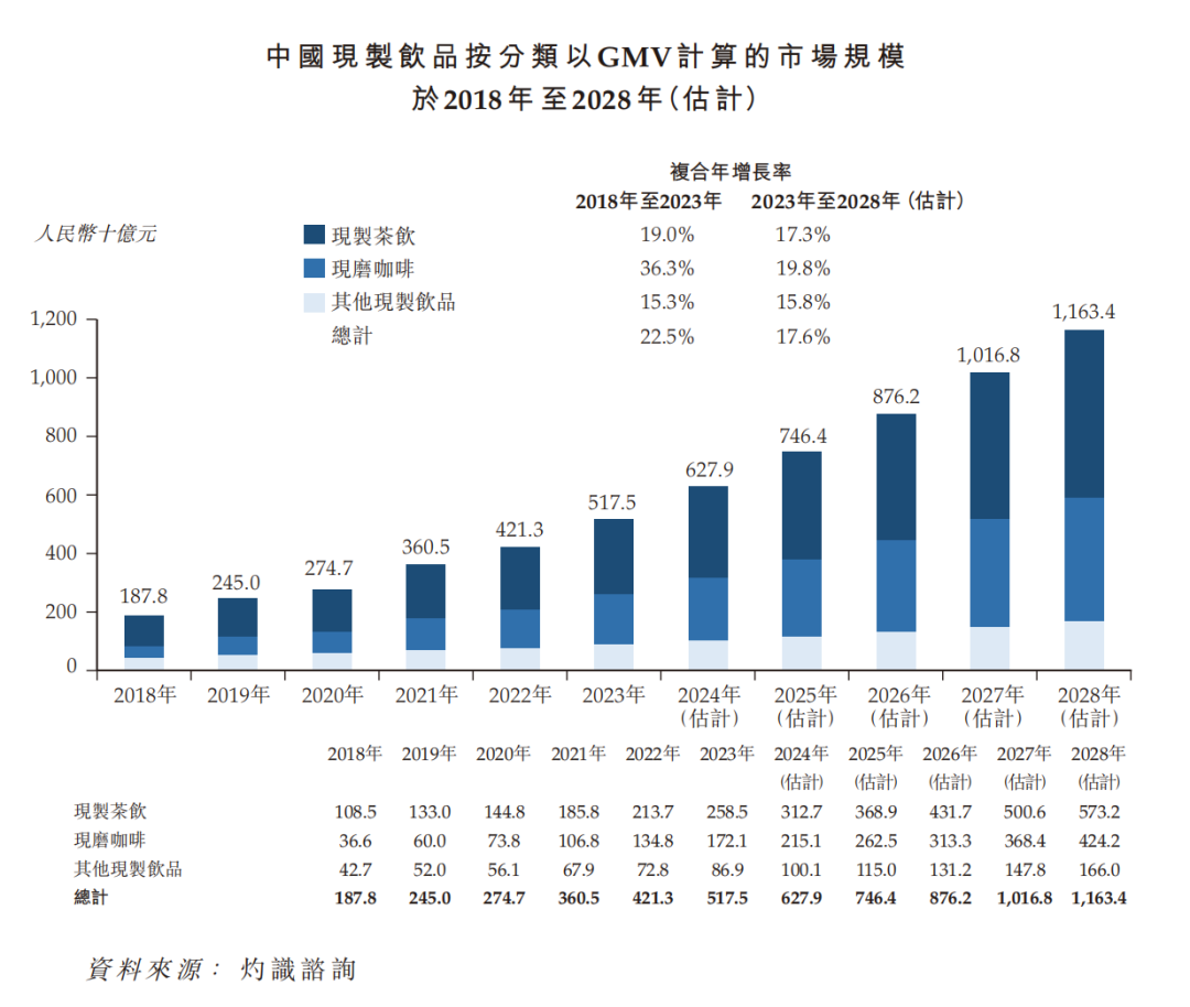 在中國龐大的現(xiàn)制飲品市場中,以2023年的GMV計,茶飲的占比最大,達到50%。最近幾年,中國現(xiàn)制茶飲市場規(guī)模迅猛增長,從2018年的1085億元增至2023年的2585億元,預計到2028年,仍將以17.3%的年復合增長率增至5372億元。