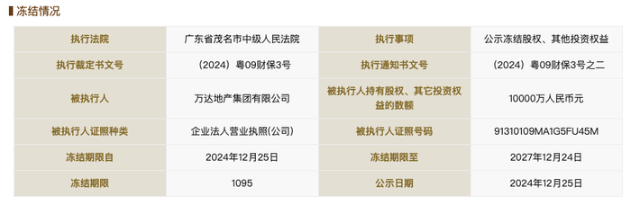 國(guó)家企業(yè)信用信息公示系統(tǒng)網(wǎng)站顯示,12月25日,萬(wàn)達(dá)地產(chǎn)集團(tuán)有限公司新增一條股權(quán)凍結(jié)信息,股權(quán)被執(zhí)行的企業(yè)為貴陽(yáng)云巖萬(wàn)達(dá)實(shí)業(yè)有限公司,凍結(jié)股權(quán)數(shù)額1億人民幣,凍結(jié)期限自2024年12月25日至2027年12月24日,執(zhí)行法院為廣東省茂名市中級(jí)人民法院。