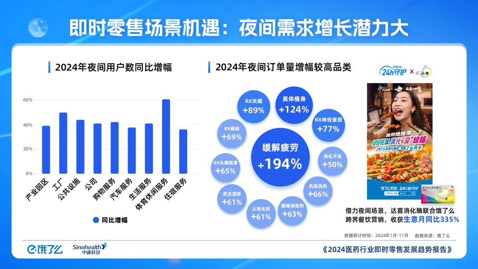 近日,餓了么聯(lián)合中康科技共同發(fā)布的《2024醫(yī)藥行業(yè)即時零售發(fā)展趨勢》顯示,季節(jié)場景需求帶動細分品類增長,例如冬季受氣候、假期等驅(qū)動,胃腸科藥、皮膚用藥等多品類外賣量大漲。同時,夜間、異地、餐零跨界等多元場景均有助于釋放消費潛力。