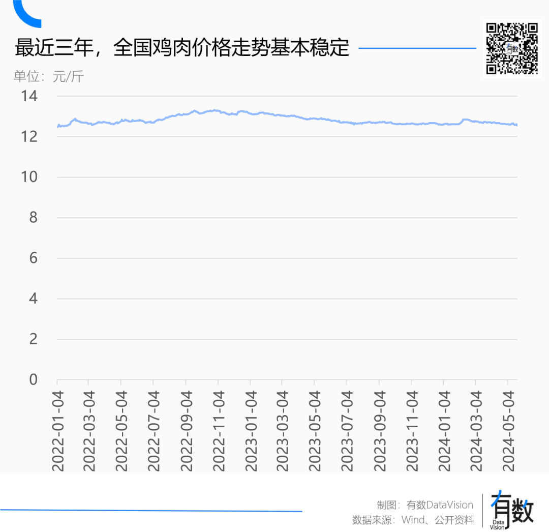 但最近三年,雞肉價(jià)格并沒有出現(xiàn)明顯漲幅,一直在12.9元/斤上下波動(dòng);甚至在年中,白羽雞的價(jià)格,一度跌破28個(gè)月以來的最低價(jià)[2]。