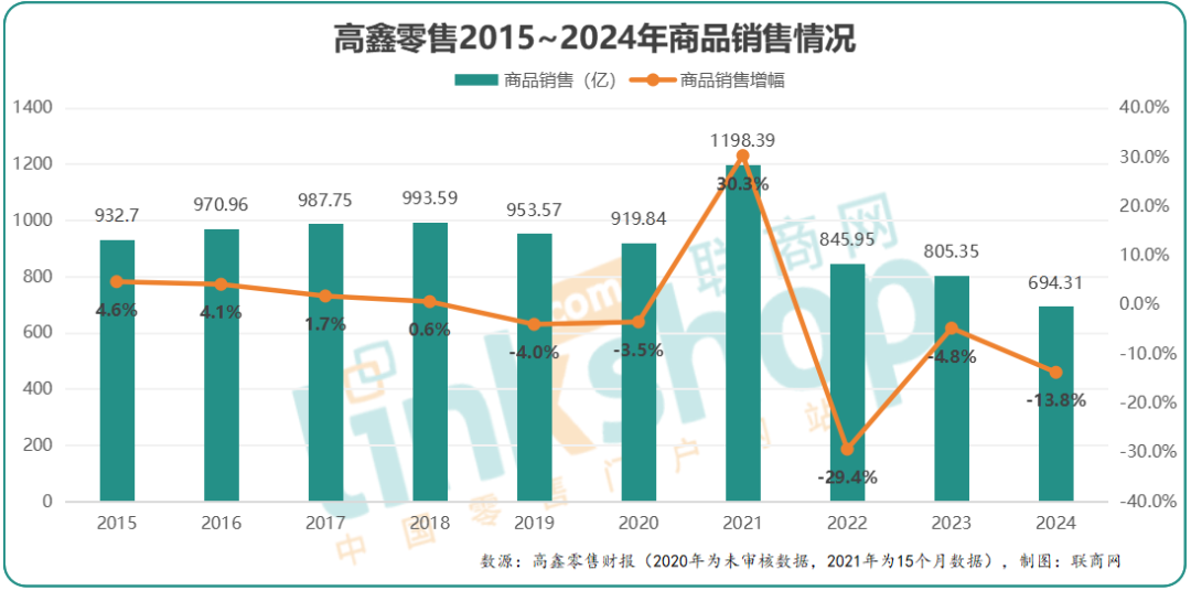 但接入阿里后的大潤(rùn)發(fā),技術(shù)用了、資源共享了,卻并未能在重構(gòu)和數(shù)字化轉(zhuǎn)型中,獲得滿意增長(zhǎng),高鑫零售的收入反倒是一路下行,特別是疫情之后三年,商品銷售業(yè)績(jī)連續(xù)下降。