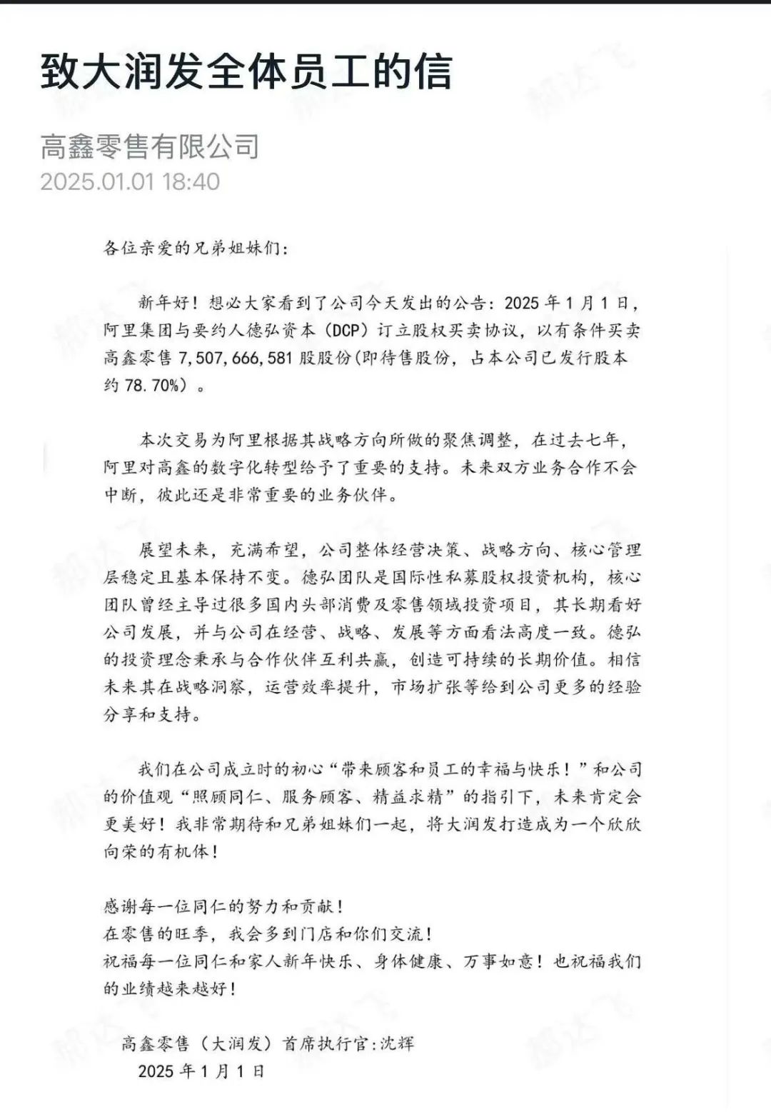 高鑫零售CEO沈輝也在今日發(fā)布了《致大潤(rùn)發(fā)全體員工的信》表示,公司與阿里的合作不會(huì)中斷,公司整體經(jīng)營(yíng)決策、戰(zhàn)略方向、核心管理層穩(wěn)定且基本保持不變。德弘核心團(tuán)隊(duì)曾經(jīng)主導(dǎo)過(guò)很多國(guó)內(nèi)頭部消費(fèi)及零售領(lǐng)域投資項(xiàng)目,其長(zhǎng)期看好公司發(fā)展。
