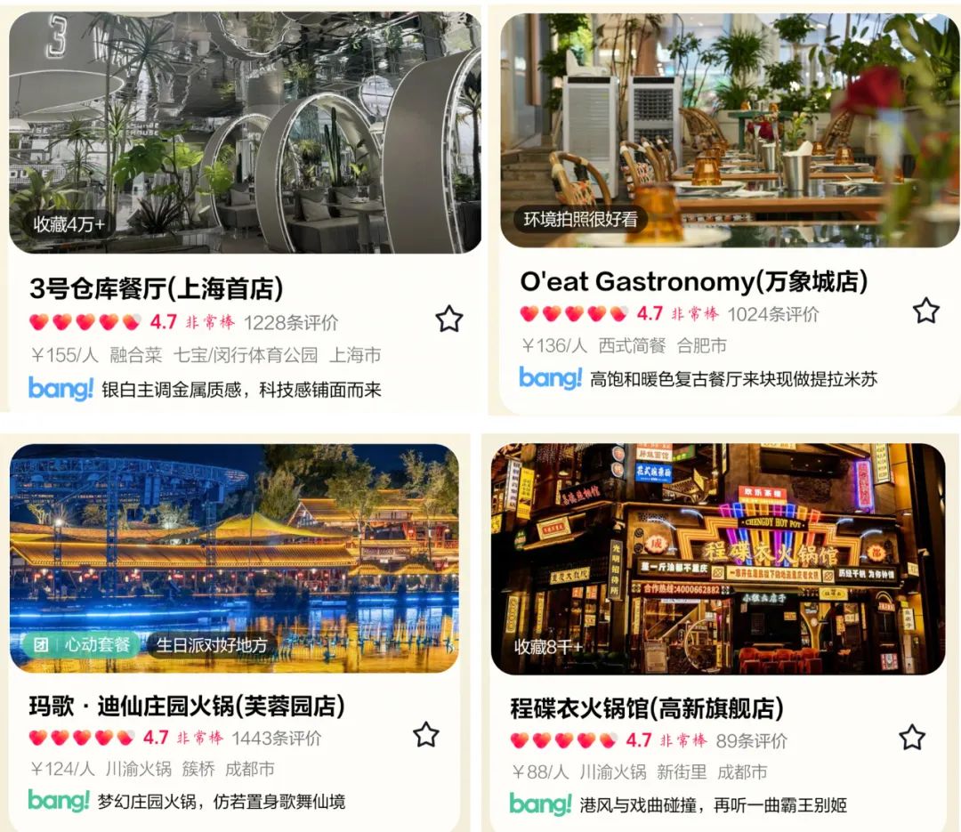 氛圍榜商家展示的是餐廳別具一格的就餐環(huán)境,像3號倉庫餐廳(上海首店)展示圖是銀色調(diào)、充滿未來科技感環(huán)境,O'eat Gastronomy(萬象城店)是被綠植包圍的餐廳一角;新潮榜則強調(diào)餐廳時尚、潮流的體驗,瑪歌·迪仙莊園火鍋(芙蓉園店)沿河的亭臺樓閣大全景,程碟衣火鍋館(高新旗艦店)則是復(fù)古霓虹燈牌裝飾的墻面。