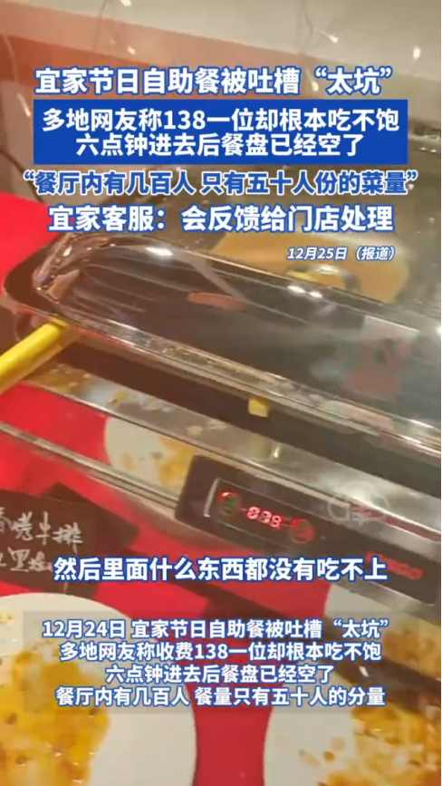 宜家推出的圣誕138元自助餐,接連被人吐槽根本吃不飽,有網(wǎng)友的視頻顯示,6點(diǎn)多進(jìn)入大部分餐盤已經(jīng)空了,餐廳內(nèi)有幾百個(gè)人,餐食的分量也不足。還有一位北京的美食博主吐槽,宜家的自助餐取餐排隊(duì)過(guò)長(zhǎng),導(dǎo)致大部分餐品都冷了,量少還不好吃。