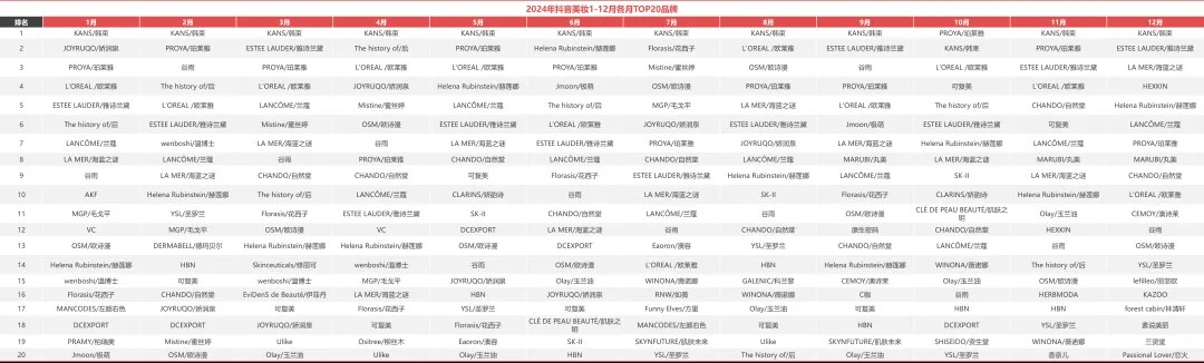 雖然2024年TOP20里面還有花西子、YSL兩大彩妝品牌的席位,但排名已較為靠后。而在2021-2023年,花西子都是位居TOP10的存在,一些彩妝白牌如FV、AKF也能沖進(jìn)TOP20,而在2024年,TOP20話語(yǔ)權(quán)幾乎被護(hù)膚品牌掌控。