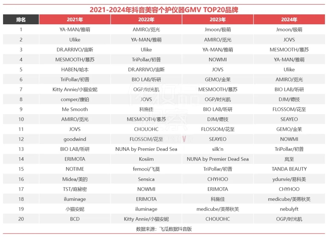 美容儀在2021-2023年也是TOP20常駐嘉賓,如雅萌、覓光、Ulike、極萌都曾躋身其中,但在政策、消費(fèi)降級(jí)、產(chǎn)品質(zhì)量問(wèn)題等多重影響因素下,2024年TOP20里面已無(wú)美容儀品牌;