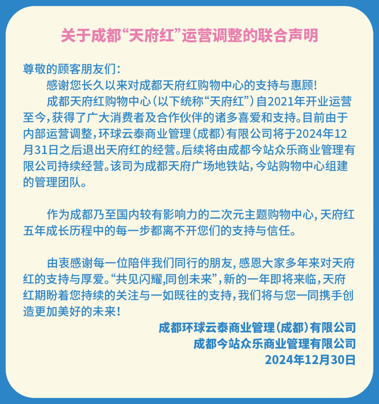 2024年12月30日,成都環(huán)球云泰商業(yè)管理(成都)有限公司與成都今站眾樂(lè)商業(yè)管理有限公司聯(lián)合發(fā)布聲明稱(chēng):目前由于內(nèi)部運(yùn)營(yíng)調(diào)整,原承租方環(huán)球云泰商業(yè)管理(成都)有限公司將于2024年12月31日之后退出天府紅的經(jīng)營(yíng)。后續(xù)將由成都今站眾樂(lè)商業(yè)管理有限公司持續(xù)經(jīng)營(yíng)。