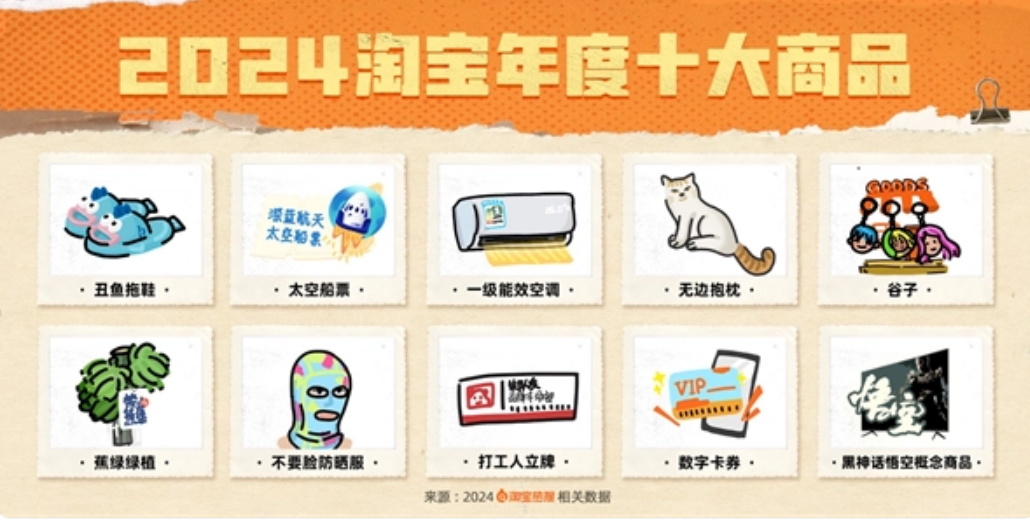 像淘寶前幾天公布的2024年度十大商品,就有不少是被外界戲稱為“發(fā)癲”的產(chǎn)品。比如丑萌的無(wú)邊抱枕、丑魚(yú)拖鞋、“不要臉”防曬服、谷子,還有玩諧音梗的“蕉綠綠植”。