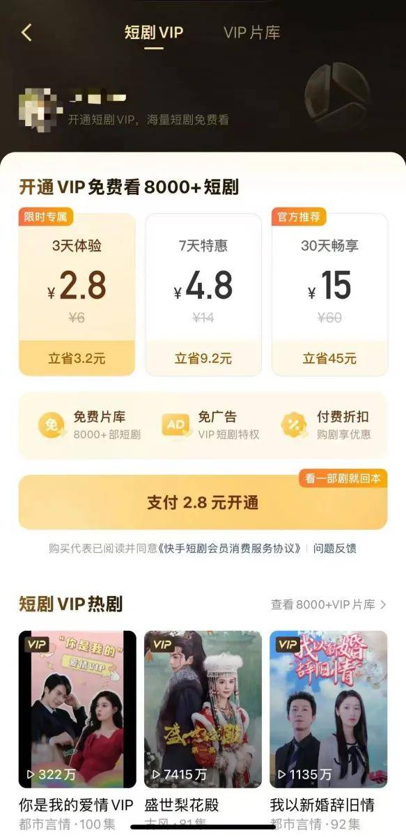 最近,快手向短劇合作方推出了全新的商業(yè)變現(xiàn)模式,即付費(fèi)短劇會(huì)員?焓钟脩(hù)開(kāi)通會(huì)員后可以在對(duì)應(yīng)期限內(nèi)免費(fèi)觀看8000 部短劇,3天、7天、30天的會(huì)員卡優(yōu)惠后價(jià)格為2.8元、4.8元、15元。