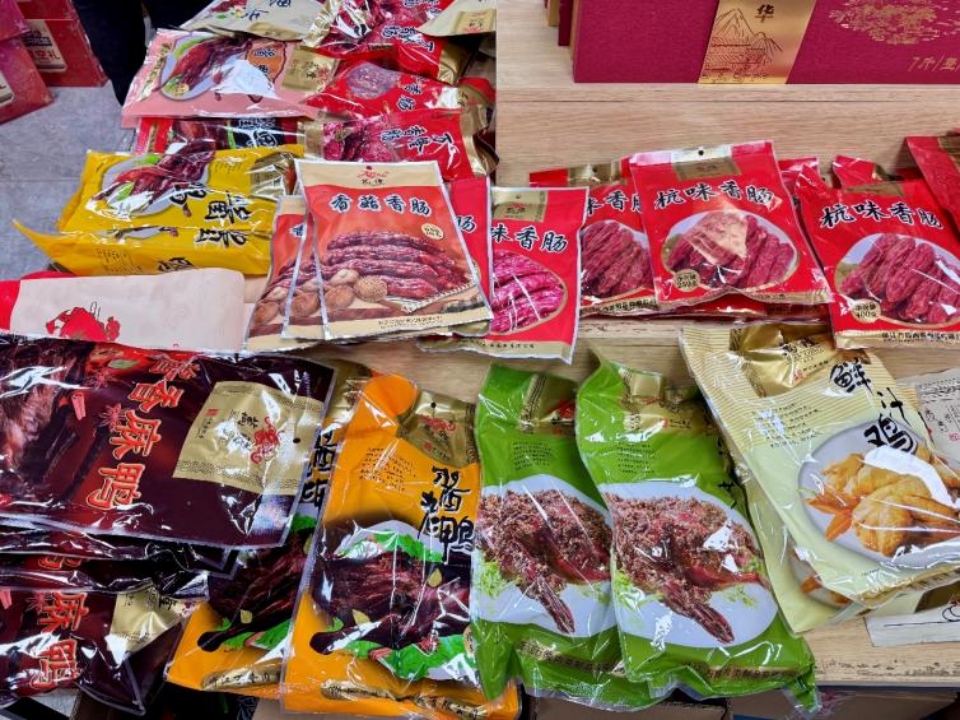 傳統(tǒng)臘味如火腿、醬鴨、香腸、醬肉、魚干……只要能成為臘味的食材,都有;蘋果、石榴、金桔、香梨……新鮮水果也是琳瑯滿目;堅(jiān)果、蜜餞、各式禮盒應(yīng)有盡有。