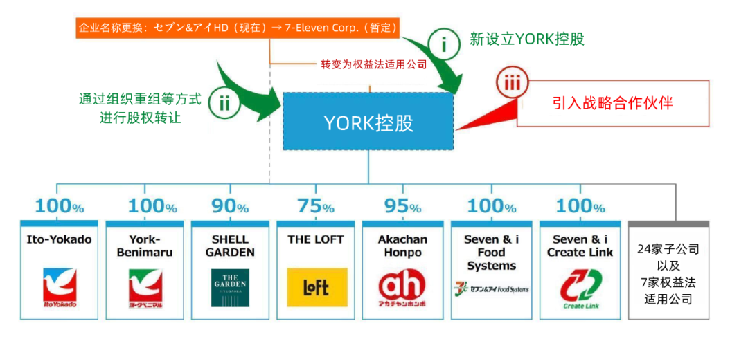 與此同時,7&i計劃將公司名稱由“Seven&i Holdings”更換為“7-Eleven Corp.(暫定)”,并且正積極推進業(yè)務(wù)分拆、籌備“York控股”的股權(quán)出售事宜。York控股是一家整合了集團31項非便利店業(yè)務(wù)的中間控股公司,旗下包括大型綜合超市伊藤洋華堂、連鎖餐廳Denny’s、生活雜貨連鎖Loft等零售和餐飲企業(yè)。