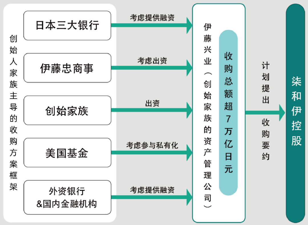 面對ACT的“窮追不舍”,7&i的內(nèi)部開始“反擊”。同年11月,7&i副總裁、創(chuàng)始人次子伊藤順朗與家族控股公司伊藤興業(yè)提出了規(guī)模達9萬億日元(約4400億人民幣)的管理層收購(MBO)計劃。為實現(xiàn)這一史無前例的收購,創(chuàng)始家族計劃聯(lián)手伊藤忠商事等投資方出資約3萬億日元(約1460億人民幣),剩余6萬億日元(約2922億人民幣)則尋求銀行貸款支持。