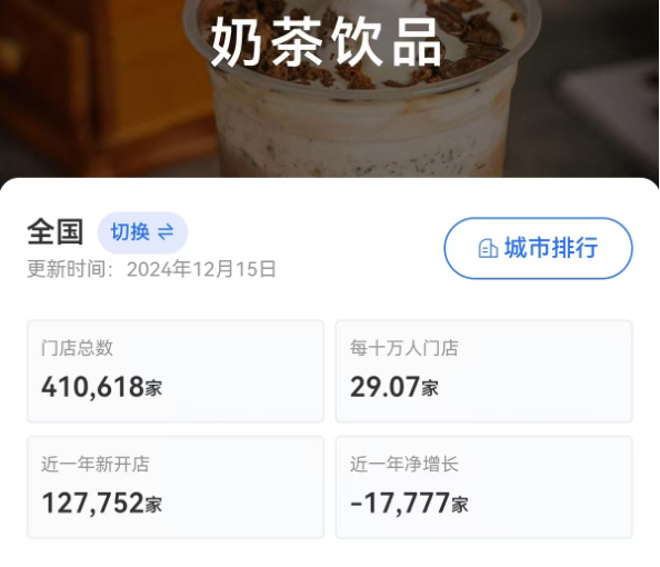 據(jù)窄門餐眼數(shù)據(jù),截至2024年12月15日的近一年時(shí)間,全國新開奶茶店12.77萬家,整個(gè)行業(yè)看起來仍是高歌猛進(jìn),而同期,凈增門店-1.78萬家。說明什么?在這一年中,有超過14萬家奶茶店選擇了關(guān)門。