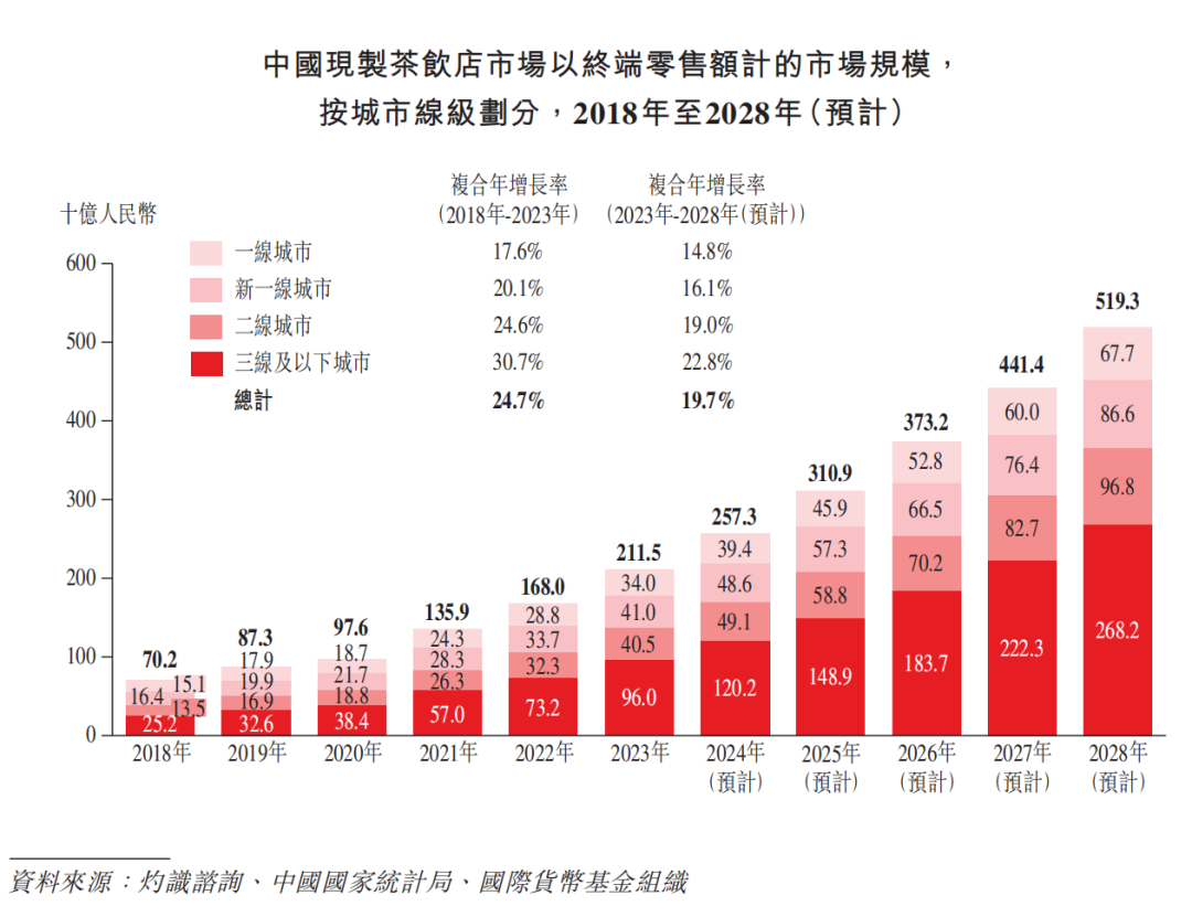 機(jī)構(gòu)數(shù)據(jù)顯示,三線及以下城市現(xiàn)制茶飲的GMV,由2018年的252億元增至2023年的960億元,復(fù)合年增長率達(dá)30.7%。機(jī)構(gòu)預(yù)計(jì),到2028年預(yù)計(jì)增至2682億元,年復(fù)合增長率22.8%,遠(yuǎn)超新茶飲市場的整體增速。