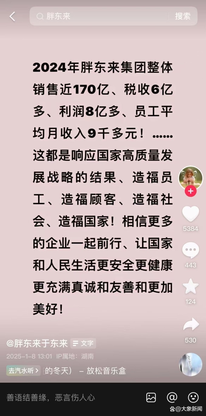 根據(jù)圖文內(nèi)容,2024年,胖東來集團整體銷售近170億,稅收6億多。于東來表示,這都是響應(yīng)國家高質(zhì)量發(fā)展戰(zhàn)略的結(jié)果,“造福員工、造福顧客、造福社會、造福國家”。